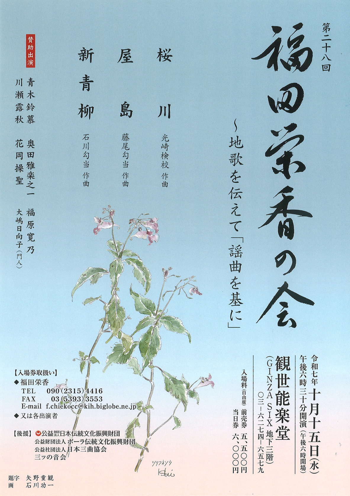 | 10月15日 | 第二十八回 福田栄香の会 日にち…2025年10月15日(水) 奥田雅楽之一副家元が《新青柳》に出演いたします。