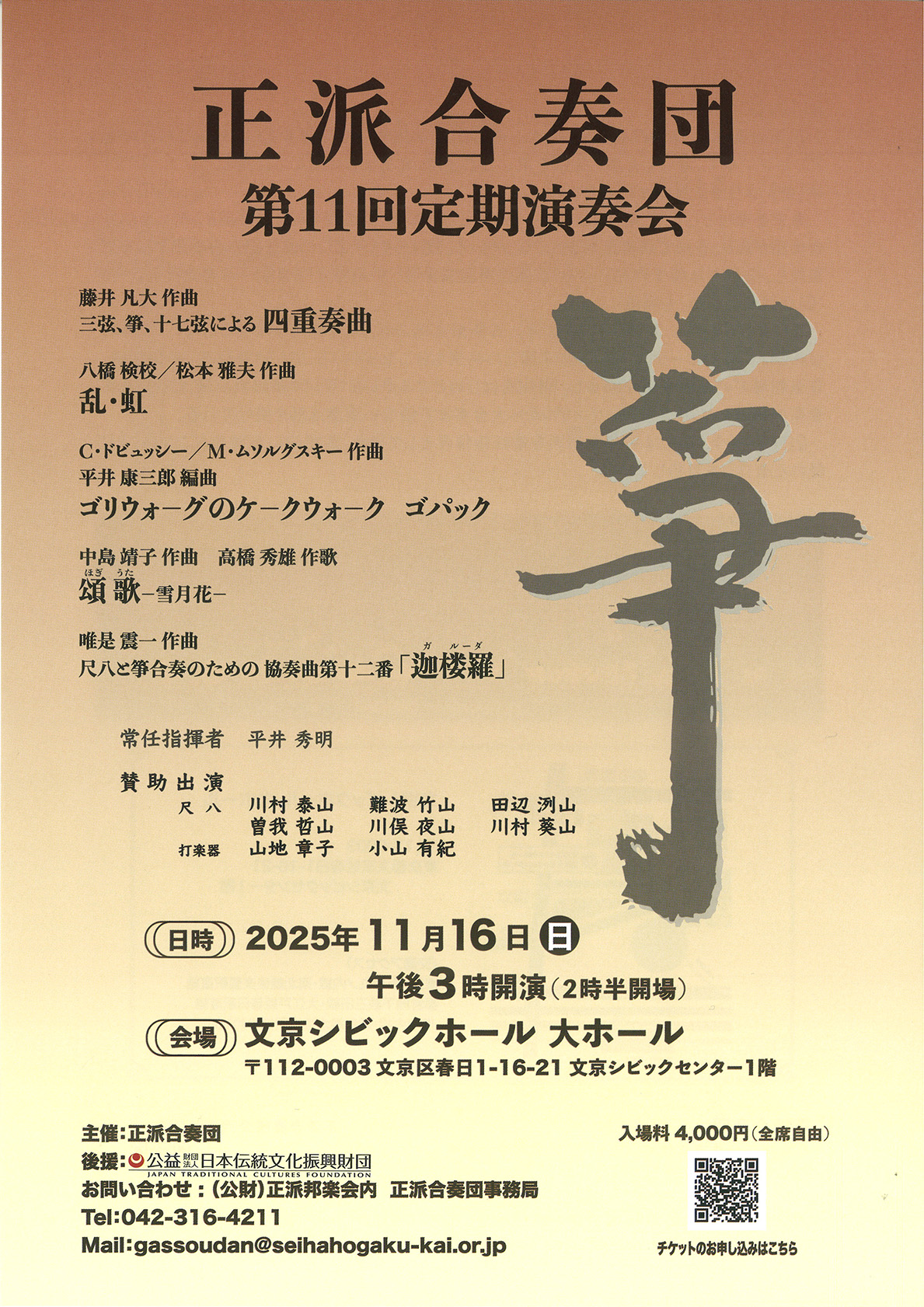 | 11月16日 | 正派合奏団 第11回定期演奏会 日にち…2025年11月16日(日) チケットお申込みは、団員または以下のメールよりお求めください |