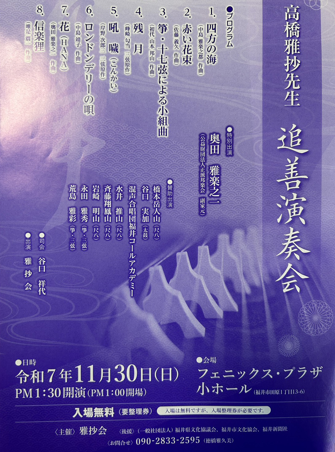 | 11月30日 | 高橋雅抄先生 追善演奏会 日にち…2025年11月30日(日) 奥田雅楽之一副家元が特別出演いたします。